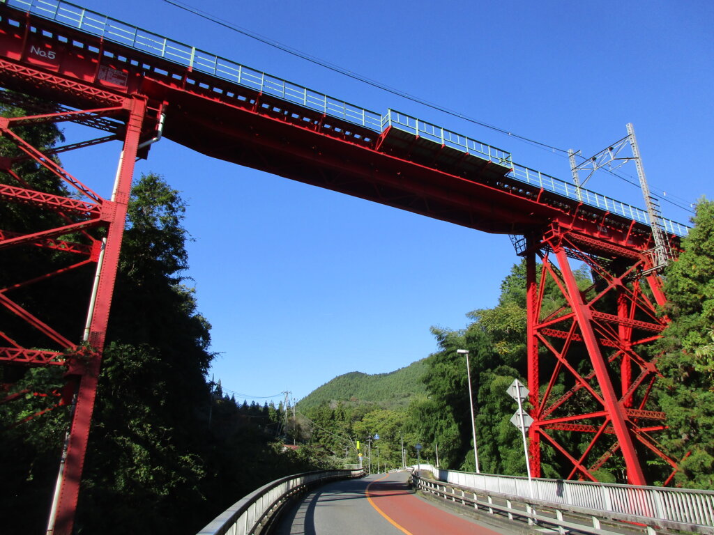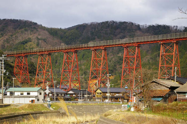 この橋梁と同じ構造で、明治45年(1912)1月に完成した旧余部橋梁(山陰本線)は東洋随一の鋼トレッスル橋で、我が国有数の橋梁です。しかし、昭和61年12月(1986)の列車転落事故を契機に、架け替えに向けた取り組みがなされ、平成22年8月(2010)に現在のコンクリート構造の余部橋梁が完成した(今でも旧橋脚の一部が残されている)。
