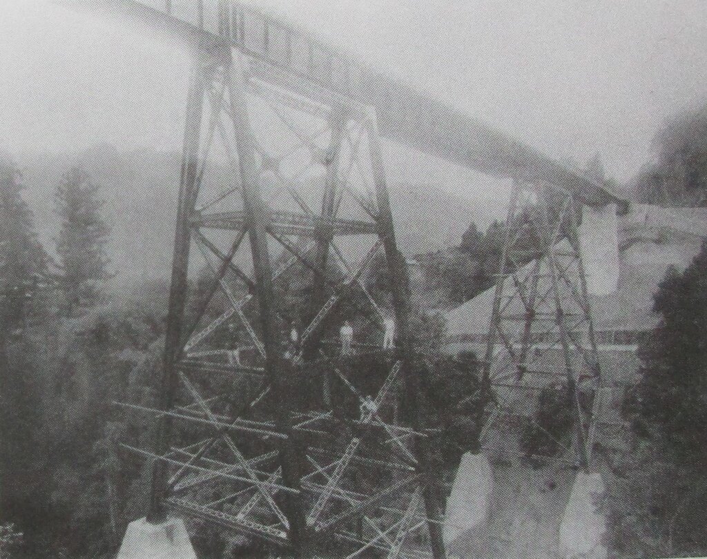 ※トレッスル橋・・・末広がりのやぐらのような橋脚で橋桁を支える構造をもつ。19世紀から20世紀の初頭のアメリカで、鉄道が谷を渡る箇所によく使われたという。アメリカ西部開拓時代などは丸太を組んで橋脚にしていたが後に鉄骨構造になった。