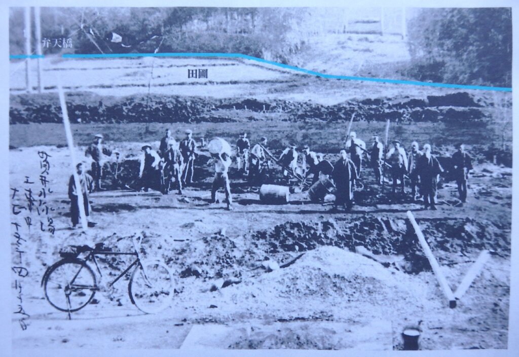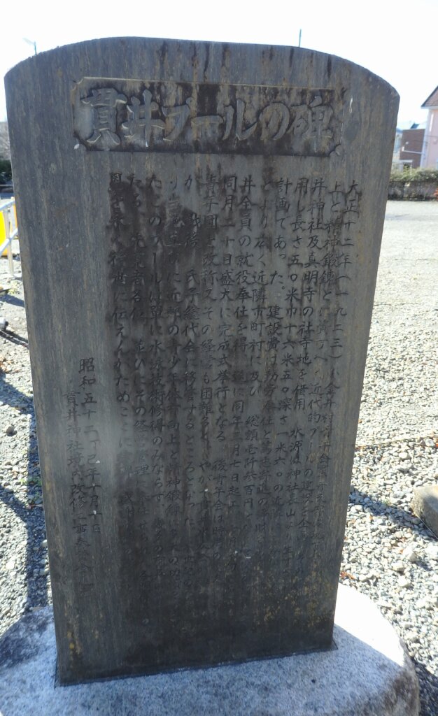 びっくりすることがあったのは大正時代に、小金井の貫井神社の湧水(57選の一つ)で50mプールを造ったことです。青年会の活動が活発であった大正期、小金井村貫井支部では神社の豊富な湧水を活用したプールを建設することになった。しかも長さ50m、幅16.5m、深さ1~1.6mの大きなプールを、勤労奉仕により大正12年(1923)3月に起工して7月に開場式を行ったと言うから、その早さに驚く。(年月及び数値については、「小金井昔ばなし」小金井市教育委員会による)完成後、関東大震災の影響はどうだっただろうか。