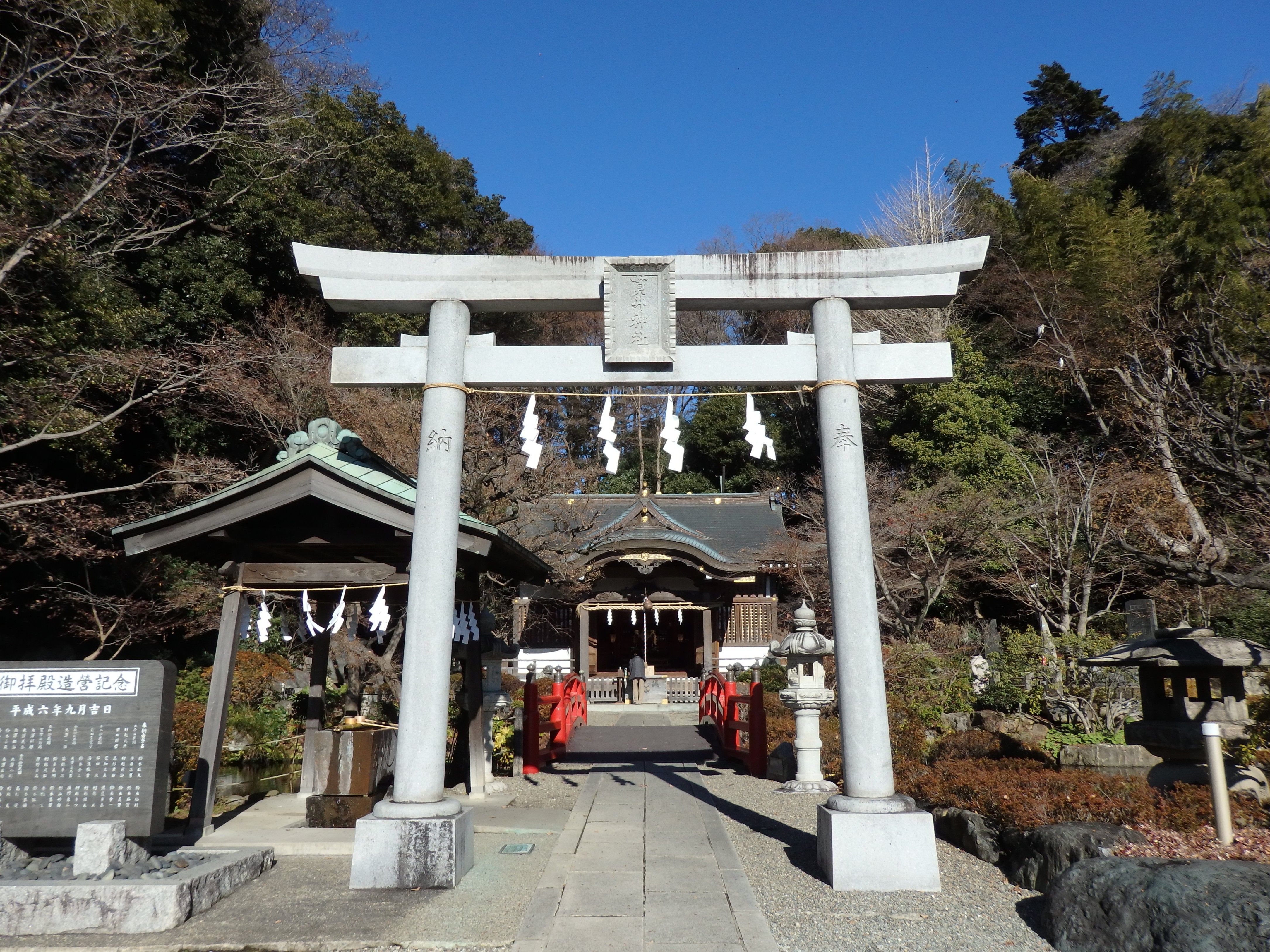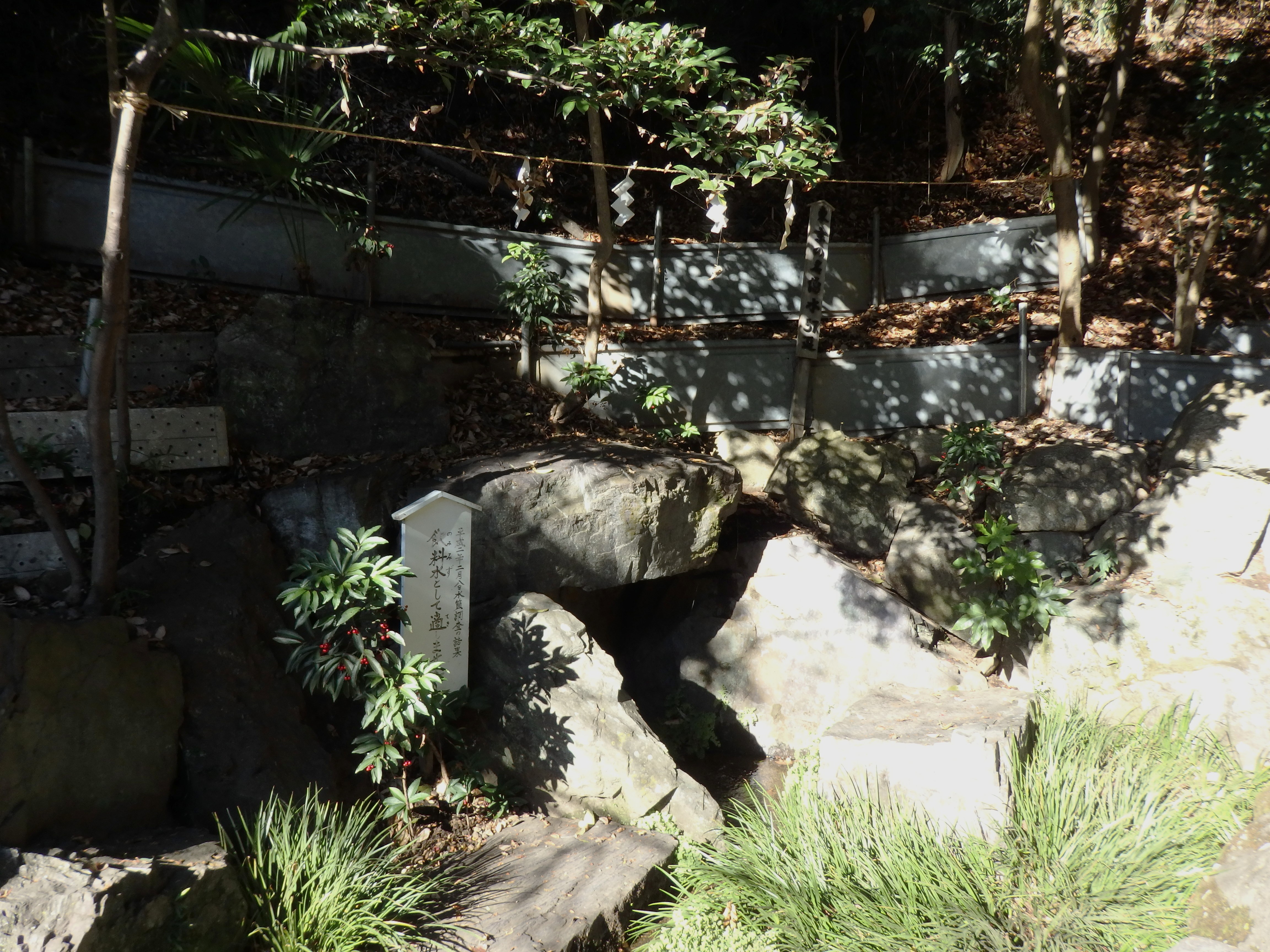 樹木が生い茂るハケを背に中腹に鎮座する貫井神社、すがすがしい雰囲気に包まれている。湧水口は本殿の左脇にあって流れを見ることができる。創立は天正18年(1590)貫井弁財天が前身と伝わる。