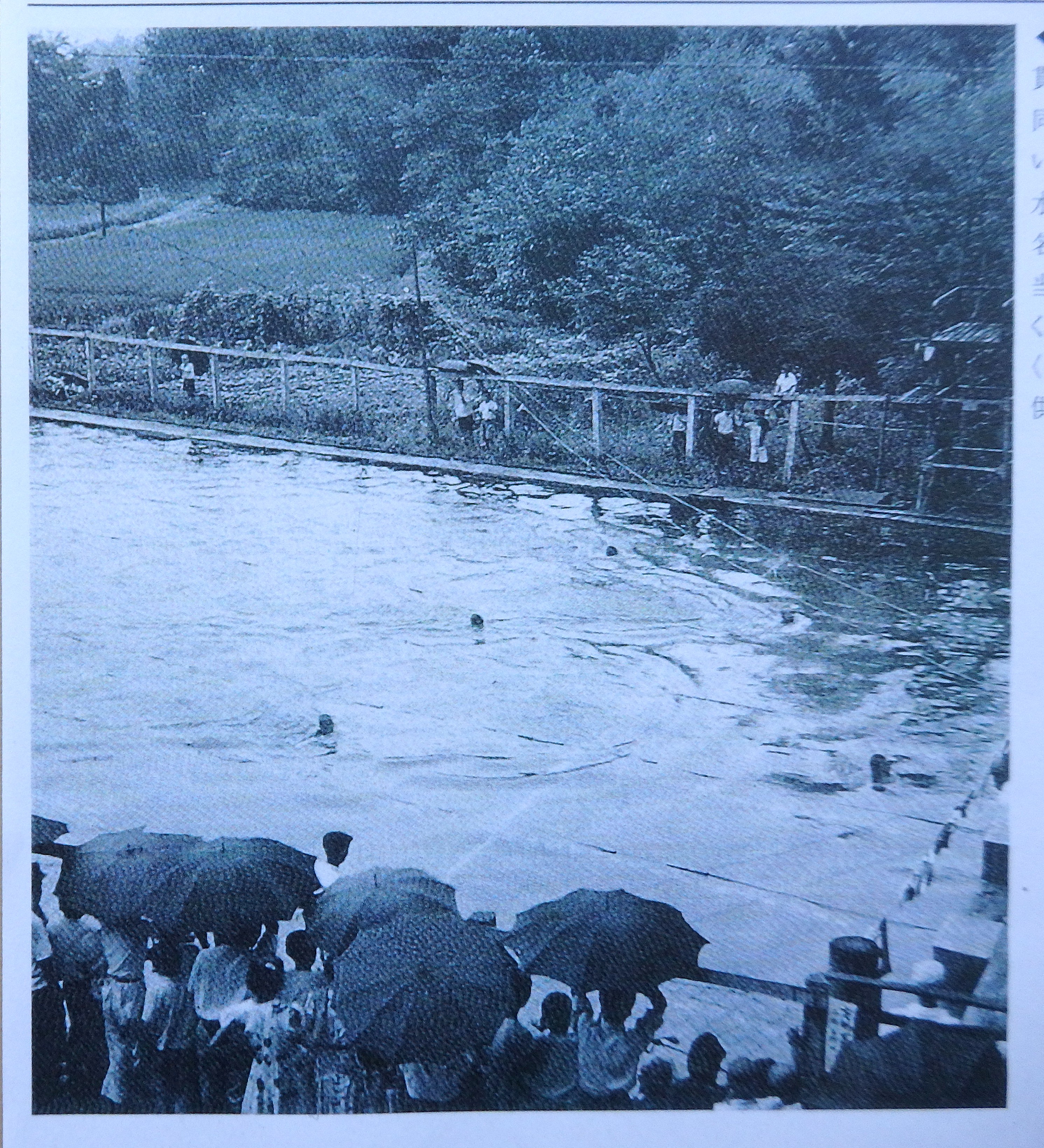 びっくりすることがあったのは大正時代に、小金井の貫井神社の湧水(57選の一つ)で50mプールを造ったことです。青年会の活動が活発であった大正期、小金井村貫井支部では神社の豊富な湧水を活用したプールを建設することになった。しかも長さ50m、幅16.5m、深さ1~1.6mの大きなプールを、勤労奉仕により大正12年(1923)3月に起工して7月に開場式を行ったと言うから、その早さに驚く。(年月及び数値については、「小金井昔ばなし」小金井市教育委員会による)完成後、関東大震災の影響はどうだっただろうか。