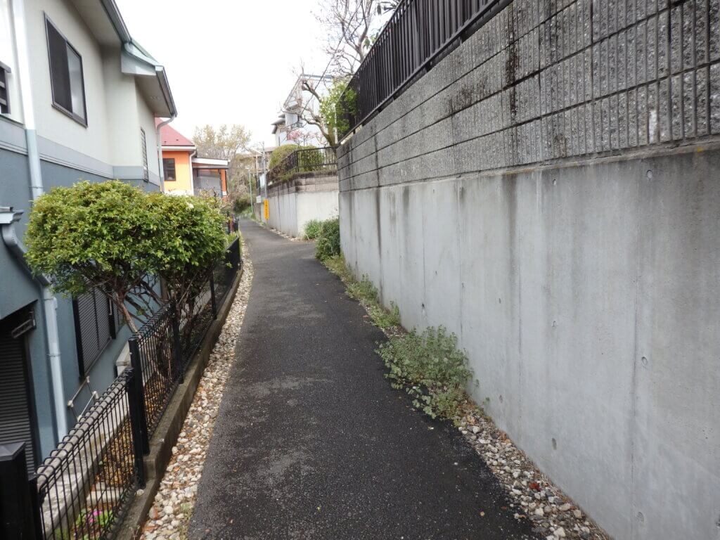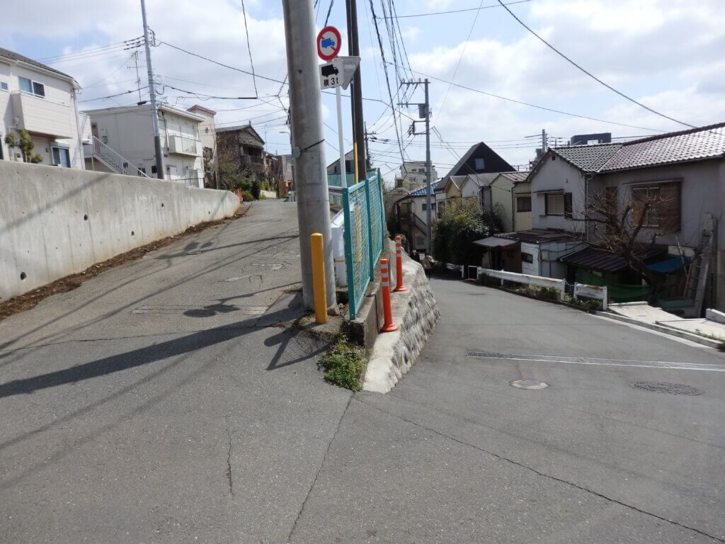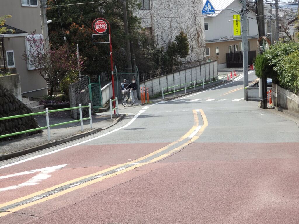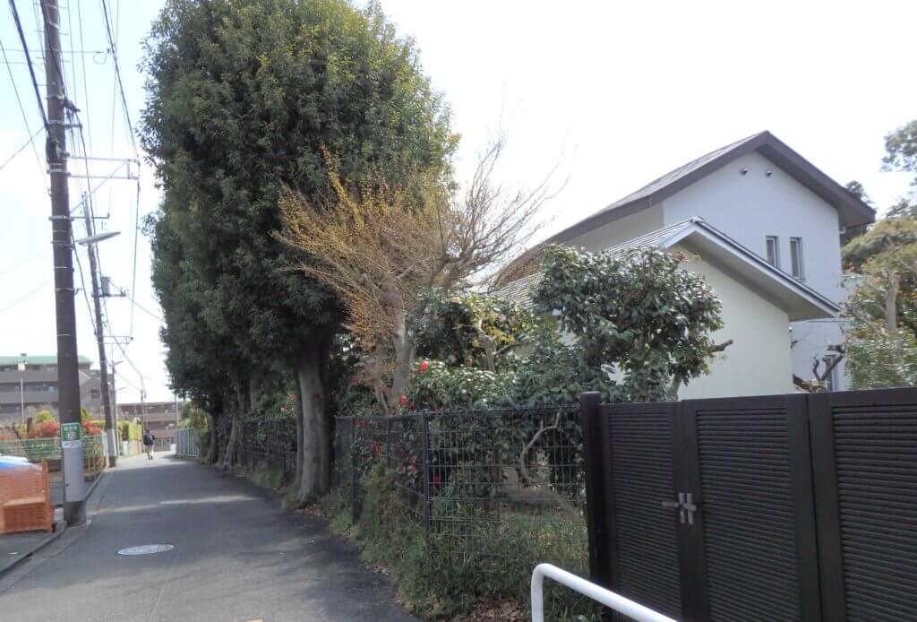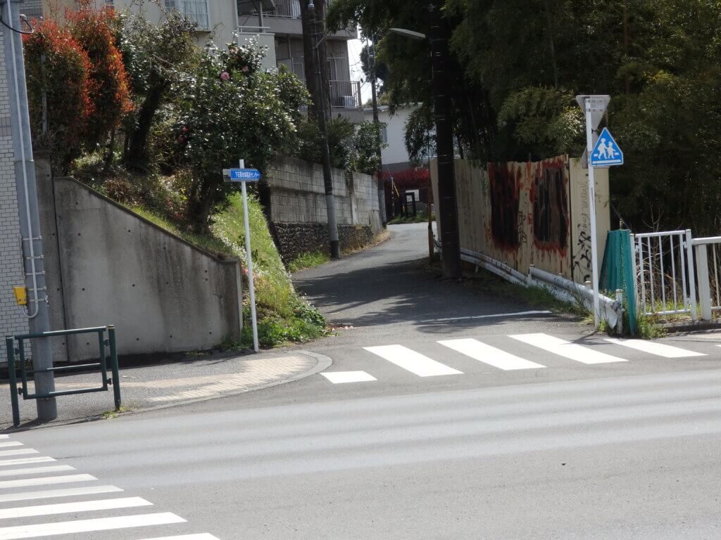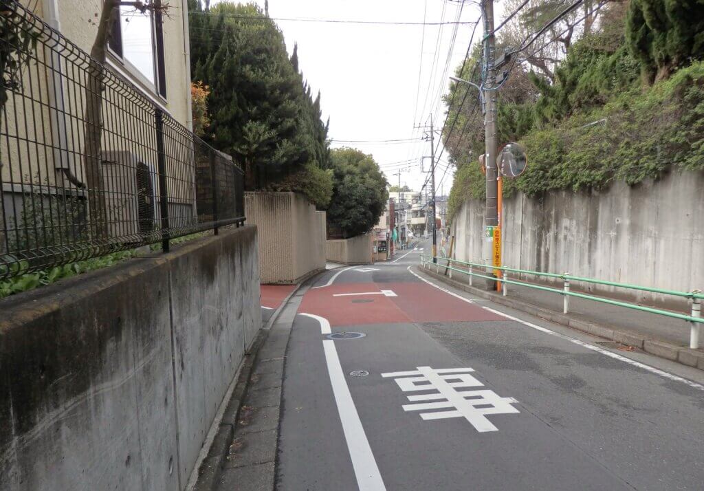 この辺りは緑が残っていて椿の生け垣などがあり、斜面には雑木林も見られて昔はこうだったんだろうなと想像させる。緩やかな下の坂(番号⑦)をおりる。