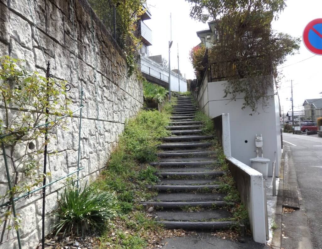 神社の裏手を回って、上の坂(番号⑤)の取り付け部からハケ道に戻る。調布病院あたりの中の坂(番号⑥))を過ぎて鶴川街道の石原橋付近を横断する。