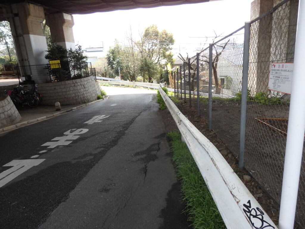 押立坂(番号②)を下り、途中を左上の戸建て住宅が並ぶ道を進む、中央高速道路をくぐって水車坂(番号③)に向かう、横切って住宅街を調布第三小学校まで歩く。