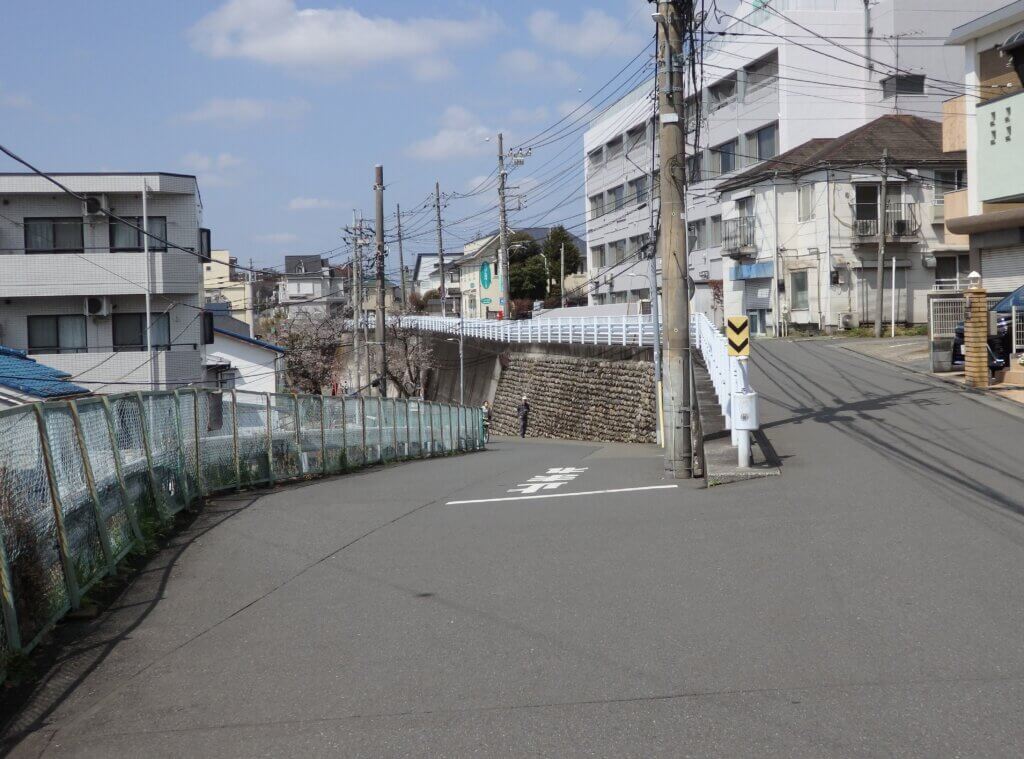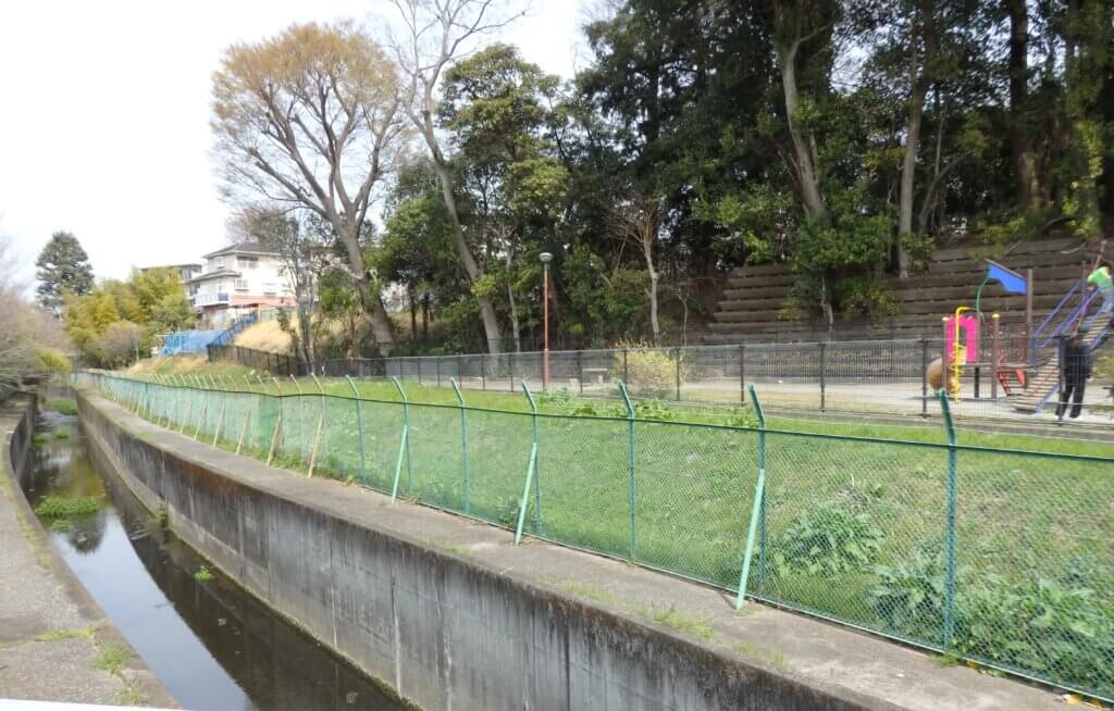 学校から先は途切れているので、階段を「凸凹児童公園」へ下りる、幼子を遊ばせる格好の広場となっている。崖下の緑地が見られるなど家族でのんびり過ごすにはいい場所だ。また、長瀞川との合流部にもなっている。