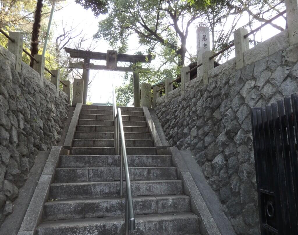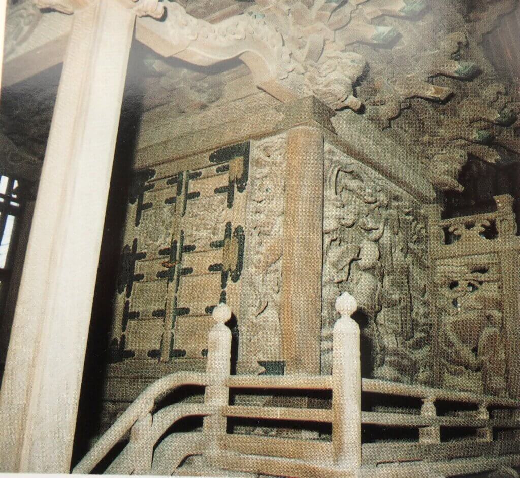 上石原村の鎮守若宮八幡神社は、八幡坂(番号④)を上がってハケ上のある。近藤勇の生家(宮川家)も氏子であり、近藤勇とも縁がある神社だ。本殿は調布市の建造物有形文化財指定第1号となっている。幣束収納箱の蓋裏に文化4年(1807)棟梁入間郡中藤村の杉田石見頭政永・同喜兵衛と墨書きがあり再建年代などが分かった。精緻な彫刻が一面に施されている。(覆堂があり中が見えない)