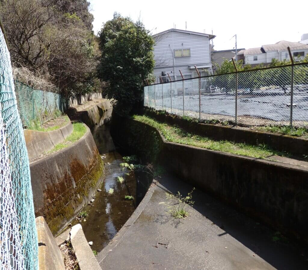 わきを流れるのは根堀川(府中用水)深さ2.4mのコンクリート護岸で湧水が流れ灌漑用だったとは思えない。