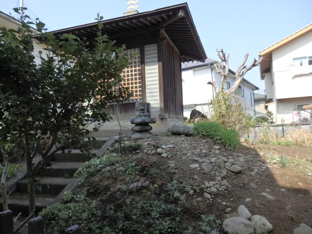 京王線飛田給駅から南へ、突き当たりの品川通りを右へ府中市との市境まで行く。調布市がハケ道として調査報告した西端から歩き始める。階段(地図の番号①)を下り、200mほど行きハケ上への階段を上る。ハケ道はあまり長くないものの、この辺りは上石原桜塚と呼ばれ、13基の古墳の存在が考えられています。市内でも墳丘が残る数少ない古墳の桜塚1号墳があるというので行ってみた。私有地に囲まれた敷地内にお堂が上にある小山を覗き見た写真がこれです。(郷土博物館に問い合わせ間違いなかった)また、7世紀中ごろの横穴式石室の基底部が発見された桜塚10号墳を記念して、石碑が社宅入口にあったので訪ねてみた。古のひとは、高台にあり見通しのよい場所を選んだのだろうか。
