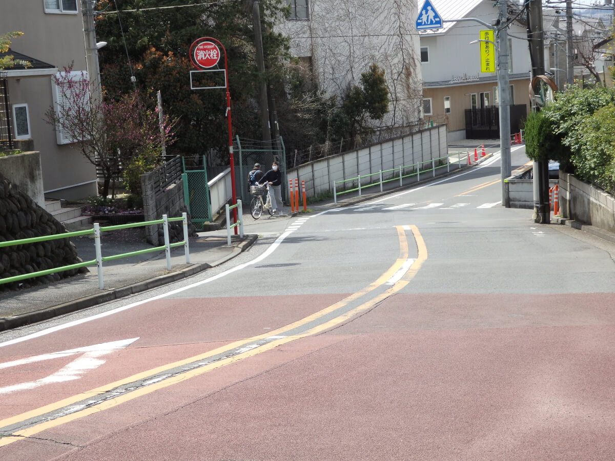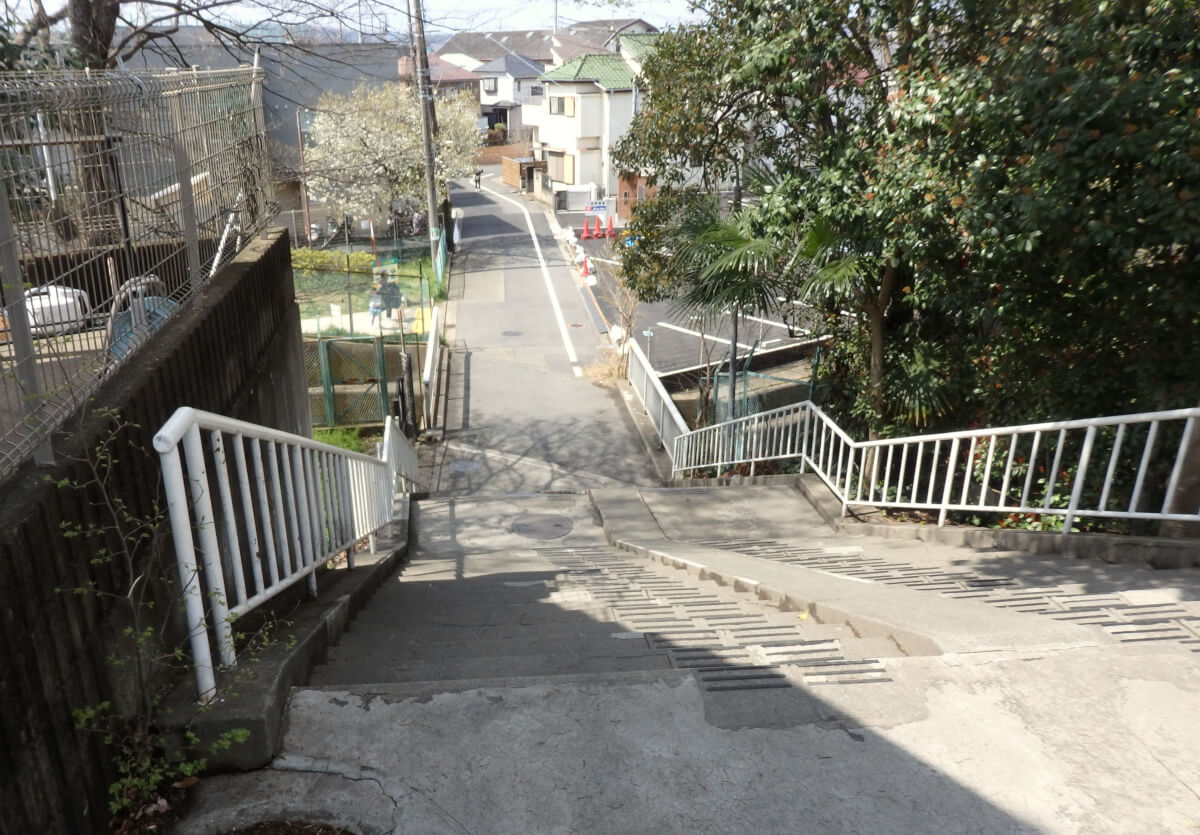 この辺りは緑が残っていて椿の生け垣などがあり、斜面には雑木林も見られて昔はこうだったんだろうなと想像させる。緩やかな下の坂(番号⑦)をおりる。