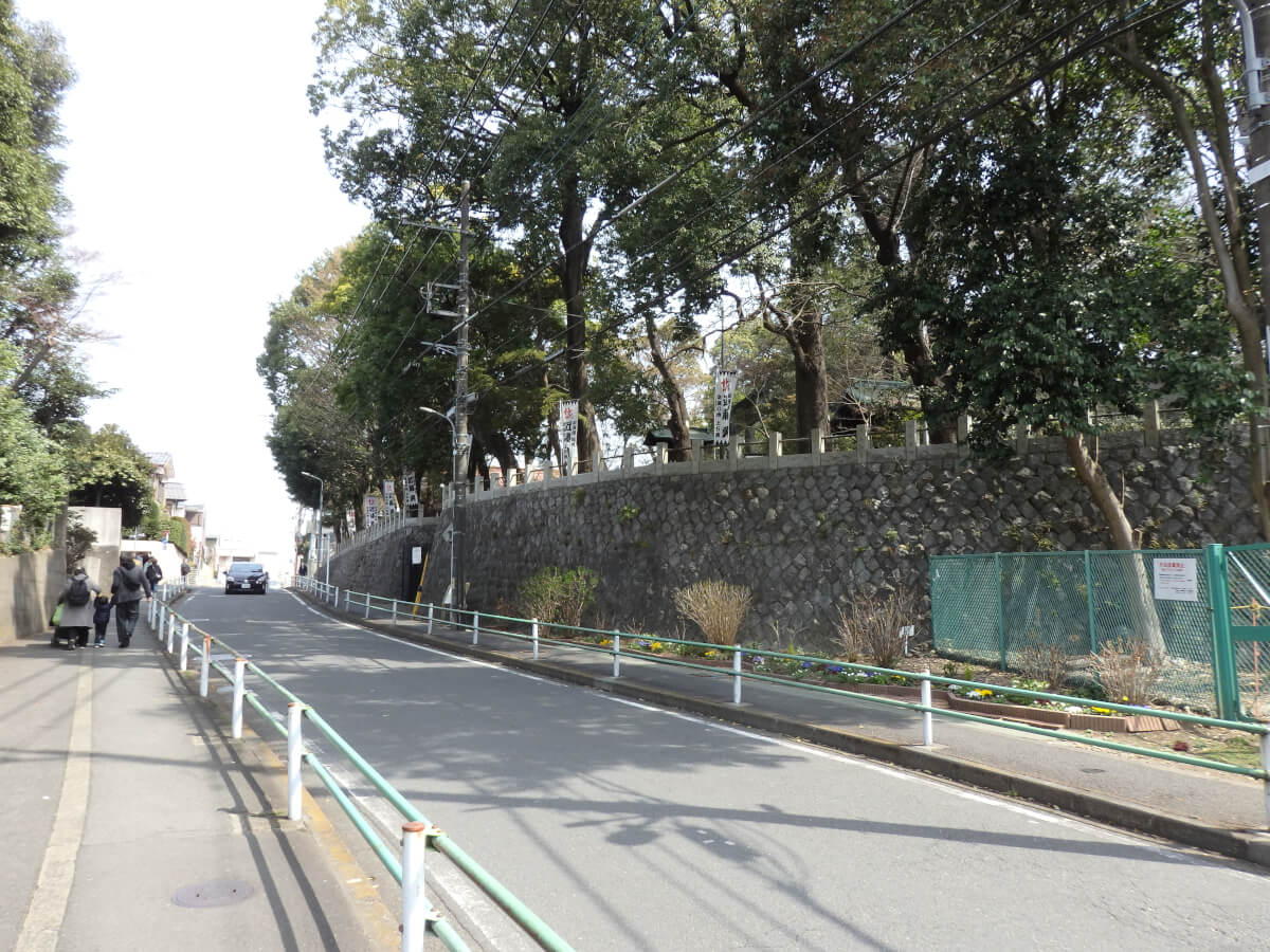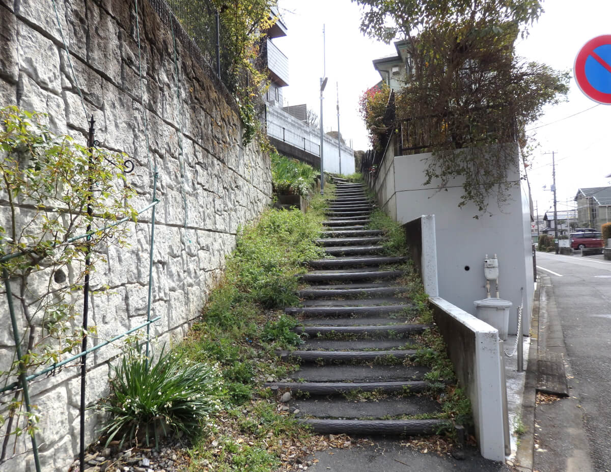 神社の裏手を回って、上の坂(番号⑤)の取り付け部からハケ道に戻る。調布病院あたりの中の坂(番号⑥))を過ぎて鶴川街道の石原橋付近を横断する。
