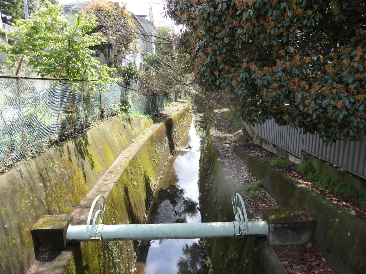 わきを流れるのは根堀川(府中用水)深さ2.4mのコンクリート護岸で湧水が流れ灌漑用だったとは思えない。