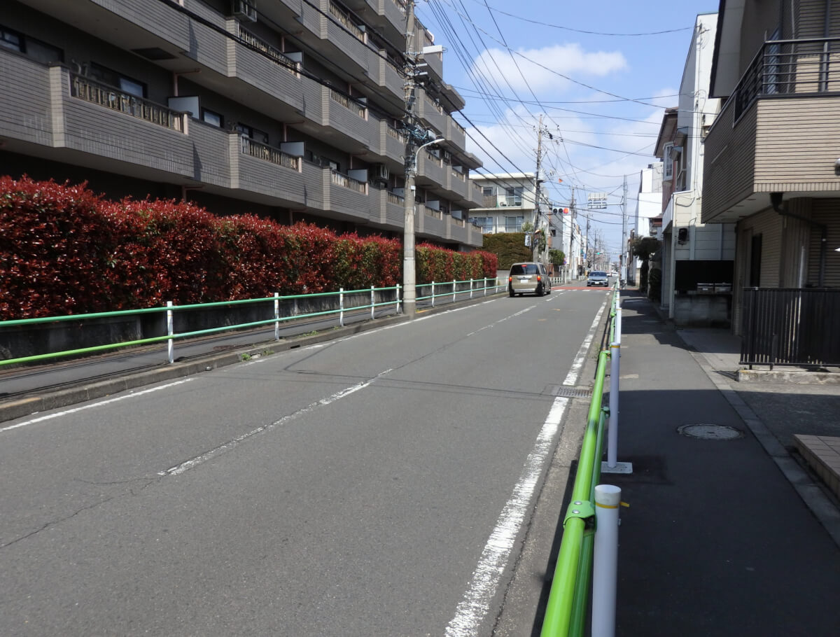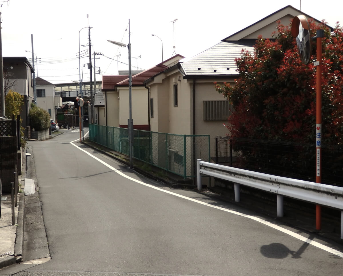 押立坂(番号②)を下り、途中を左上の戸建て住宅が並ぶ道を進む、中央高速道路をくぐって水車坂(番号③)に向かう、横切って住宅街を調布第三小学校まで歩く。