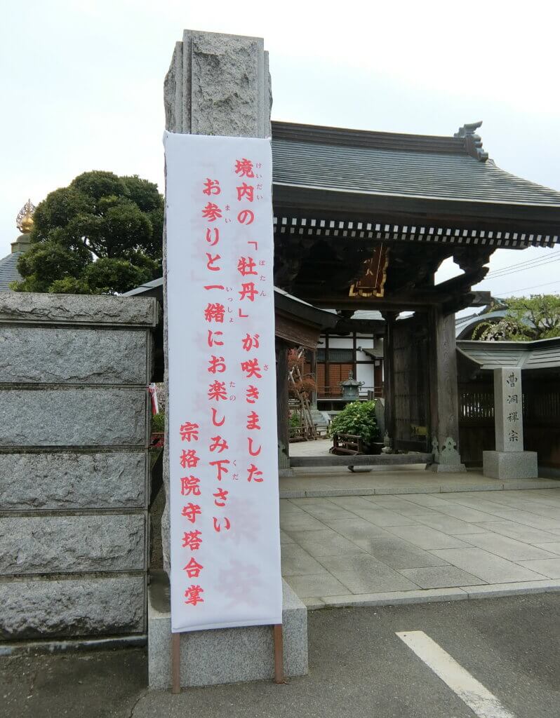 桜の散る頃、八王子市千人町2丁目にある「宗格院」にボタンを観に行きました。まだ開花には早いかなと思いつつ咲いていることを期待して行くと山門の前に「牡丹が咲きました」という案内がありました。