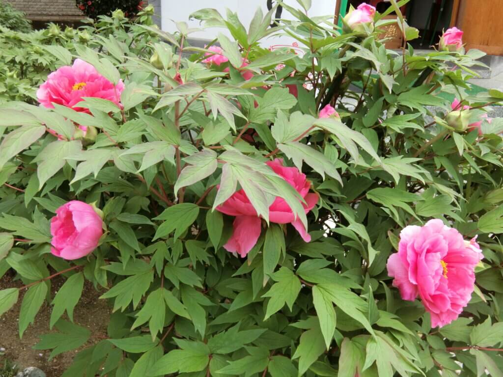 境内に125株あるというボタンの一株一株に品種が書かれた札が付いていました。ご住職のお話しによると、花の苗木はボタンで有名な島根県大根島の由志園から取り寄せているそうです。沢山の株の中には、同じ品種のものでも蕾を持ちながら開花しないものがあったり、枯れるものもあり、年に7,8株は新しい株を植えているということでした。訪れた日は赤、桃色系の花は咲いていましたが、黄色系の花は開花が遅くこれから見頃を迎えるということでした。その中で、黄色系でもまりもという品種の花は開花し始めていました。この花は咲き始めは黄色く、開いてくると白くなるそうです。赤系、桃色系といってもその濃淡は様々で、他にも白、紫等もあり、大きさも大輪もあれば小さなものもあります。花弁も幾重にも重なったもの、少ないものと千差万別の花が咲いていました。今回見た花は30種類近くでしたが、一つ一つの花に付いた名前(品種名)にはどういう意味があるのだろうかと考えながらその優雅さ、愛らしさを眺めていると、ご住職が桃色の花を指さして「この社(やしろ)は一株に45も花を付けるんだよ。」と教えて下さいました。