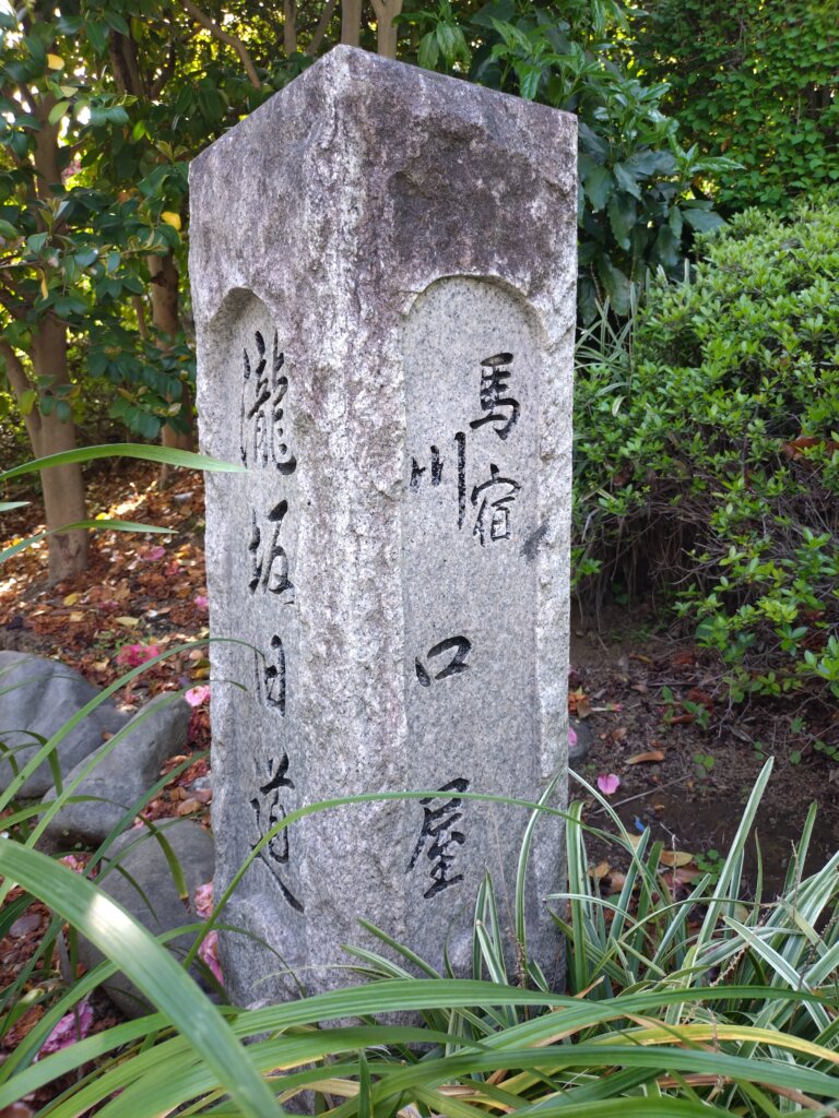 新道と合流するあたりに、「馬宿 川口屋」の碑があります。川口屋は、江戸時代に難所として知られた滝坂を越える旅人や行商人が、馬と共に休憩・宿泊するための宿でした。この石碑は、川口屋の歴史を残すために地元の人により立てられました。