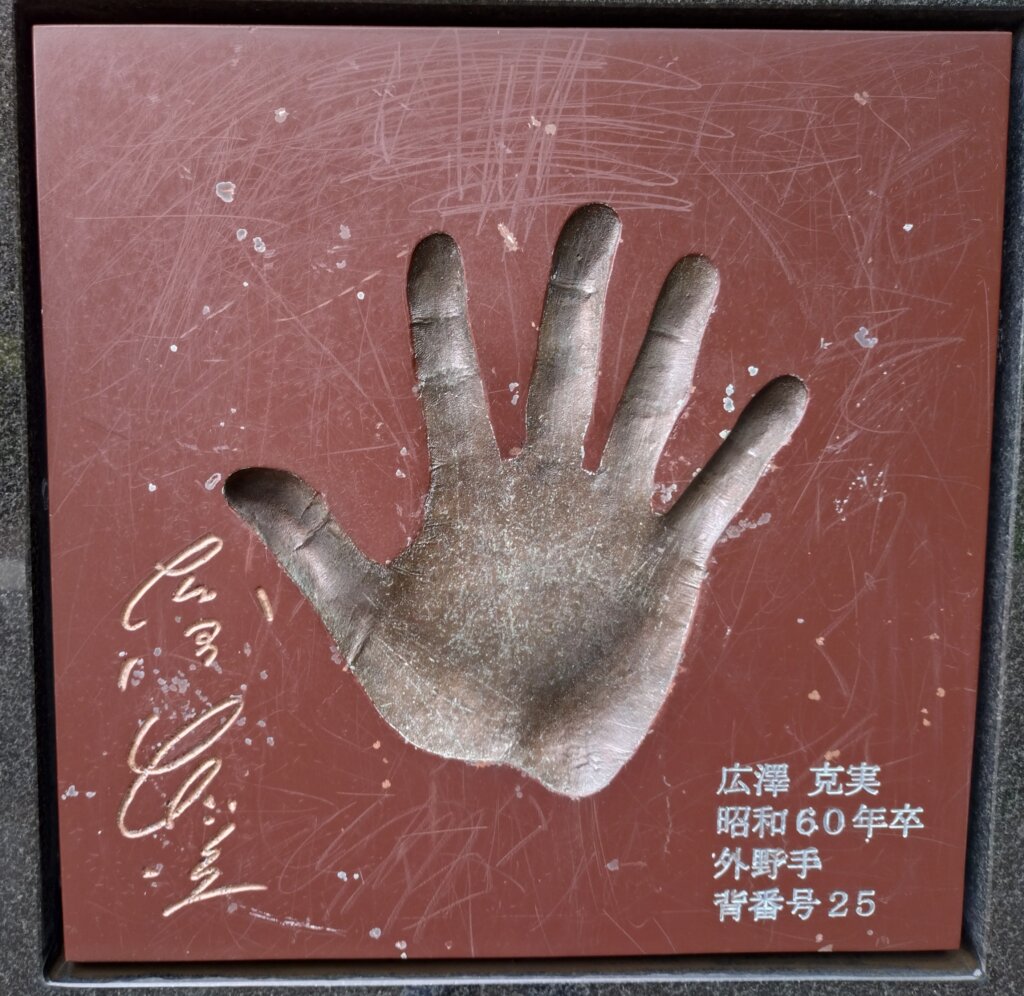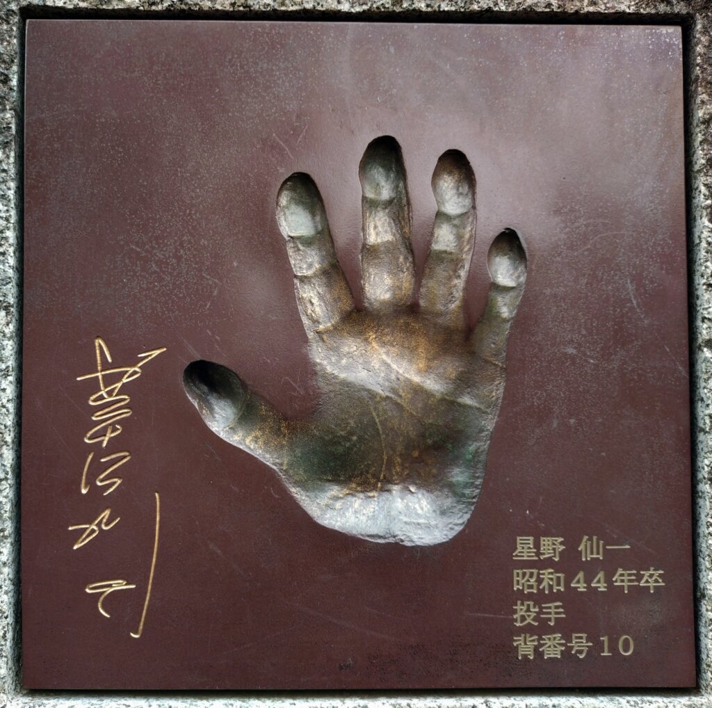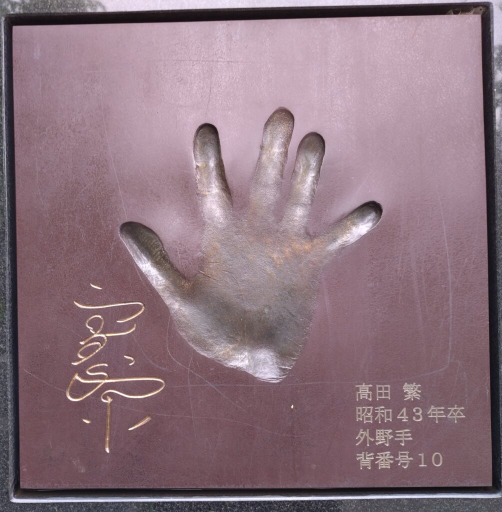 そして跡地であるここ調布には、「島岡球場」を記念して、モニュメントが建てられています。星野仙一、高田繁、広澤克己といった明大野球部が生んだ昭和世代にはおなじみの選手の手形も記念碑となっています。