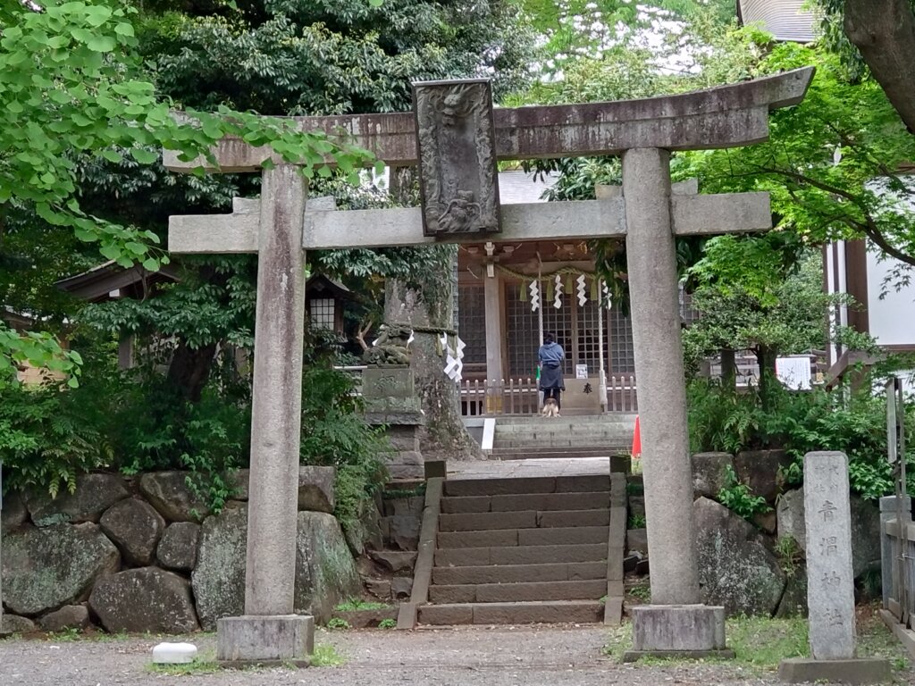 突き当たると三鷹通りで、向側が青渭神社です。青渭神社は、延喜式内社武蔵國多摩郡八座のひとつとされています。江戸時代の深大寺村の総鎮守である青渭神社の境内には、大きなケヤキの古木があります。高さは約34メートル、目通り(目の高さ)の幹の太さは約5.5mで、指定文化財とされています。