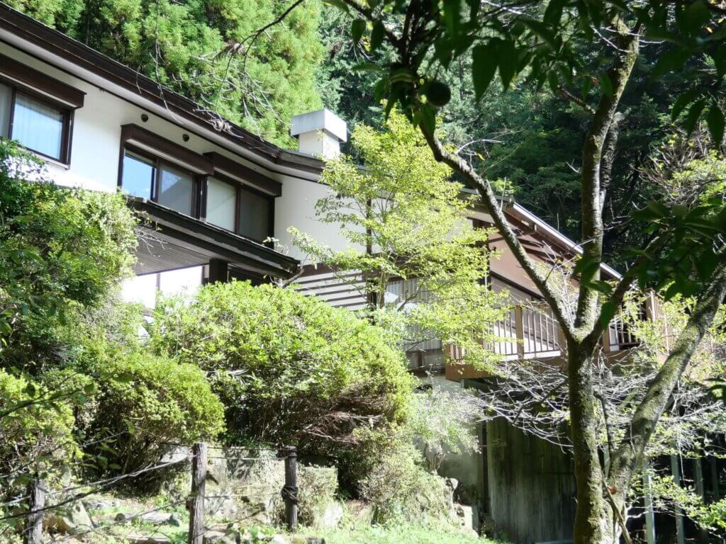 一行は北大久野川沿いの道路から分かれて小長井入沢沿いの道に入った。山間の最後の民家から数分のスギ林に覆われた先に、きょうのメインポイントの日の出山荘の入口がひょっこり姿を現した。