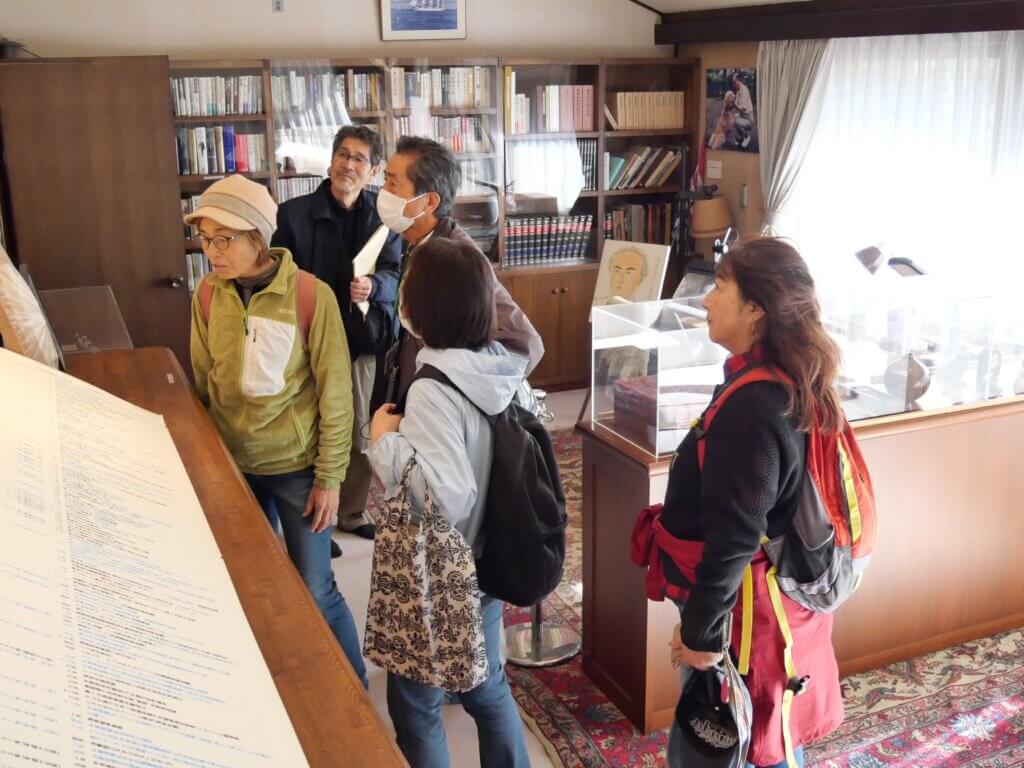 山荘の敷地に入り、受付事務の原ヨネ子さんの案内が始まり、中曽根康弘氏が泳いだプール、全斗煥元韓国大統領から贈られた鐘、庭園の木々やモミジの紅葉、バナナの大木、母屋である青雲堂の囲炉裏を囲んだレーガン大統領夫妻と中曽根氏夫妻の昼食会の様子、庭の池、天心亭でロン・ヤスの2人だけで行われた日米首脳会談など長年、中曽根氏の側で働かれた原さんならではの案内で参加者の皆さんが納得されていた様子に安堵した。書院などを見学された皆さんは、部屋の作りや展示パネルを見て当時の中曽根氏の活動を思い出された様子でもあった。