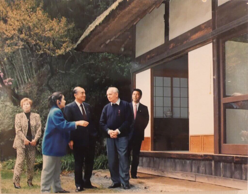 もう一人、歴史上の大統領が山荘の客人に名を連ねている。ソビエト連邦最後の大統領となったミハイル・ゴルバチョフ氏だ。ソ連国民の自由など民主化を訴え、国内の経済や政治体制を立て直す「ペレストロイカ(ロシア語で再構築)」を唱えて世界の冷戦時代を解消する改革運動を行った。同大統領は日の出町役場を訪ねた後、大久野小学校で児童の授業を参観した。農作業も見学して農業者を慰労した。この後、日の出山荘入りしたゴルバチョフ氏は中曽根氏のもてなしを受け昼食を共にした。