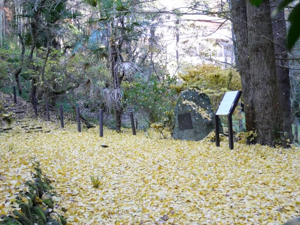 山の斜面を生かした庭の奥には碑がある。『くれてなお命の限り蝉しぐれ』。薄暗くなった山中でもセミたちは命を振り絞るように一心不乱に鳴き続けている様子を歌ったものだ。「自身の心境を反映させている」と句碑の解説板にあった。中曽根氏の代表作だという。句碑の周囲は、イチョウが黄葉を敷き詰めたように落葉していた。