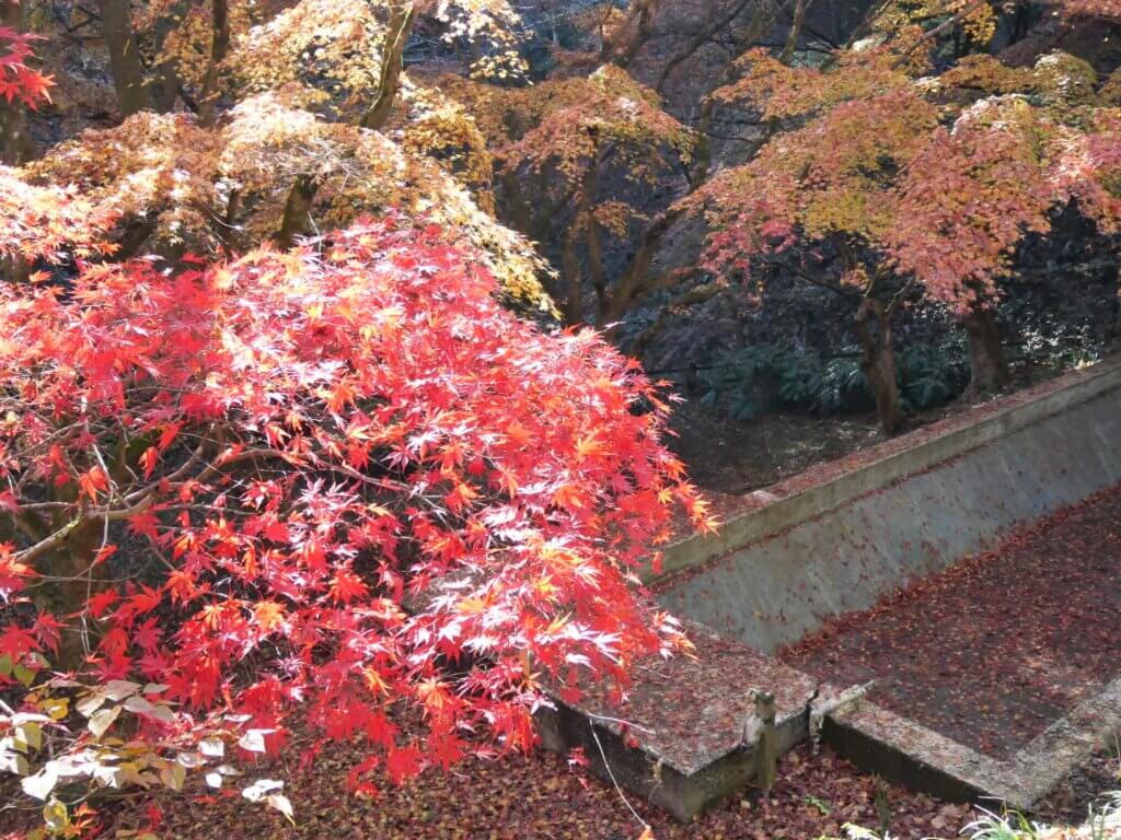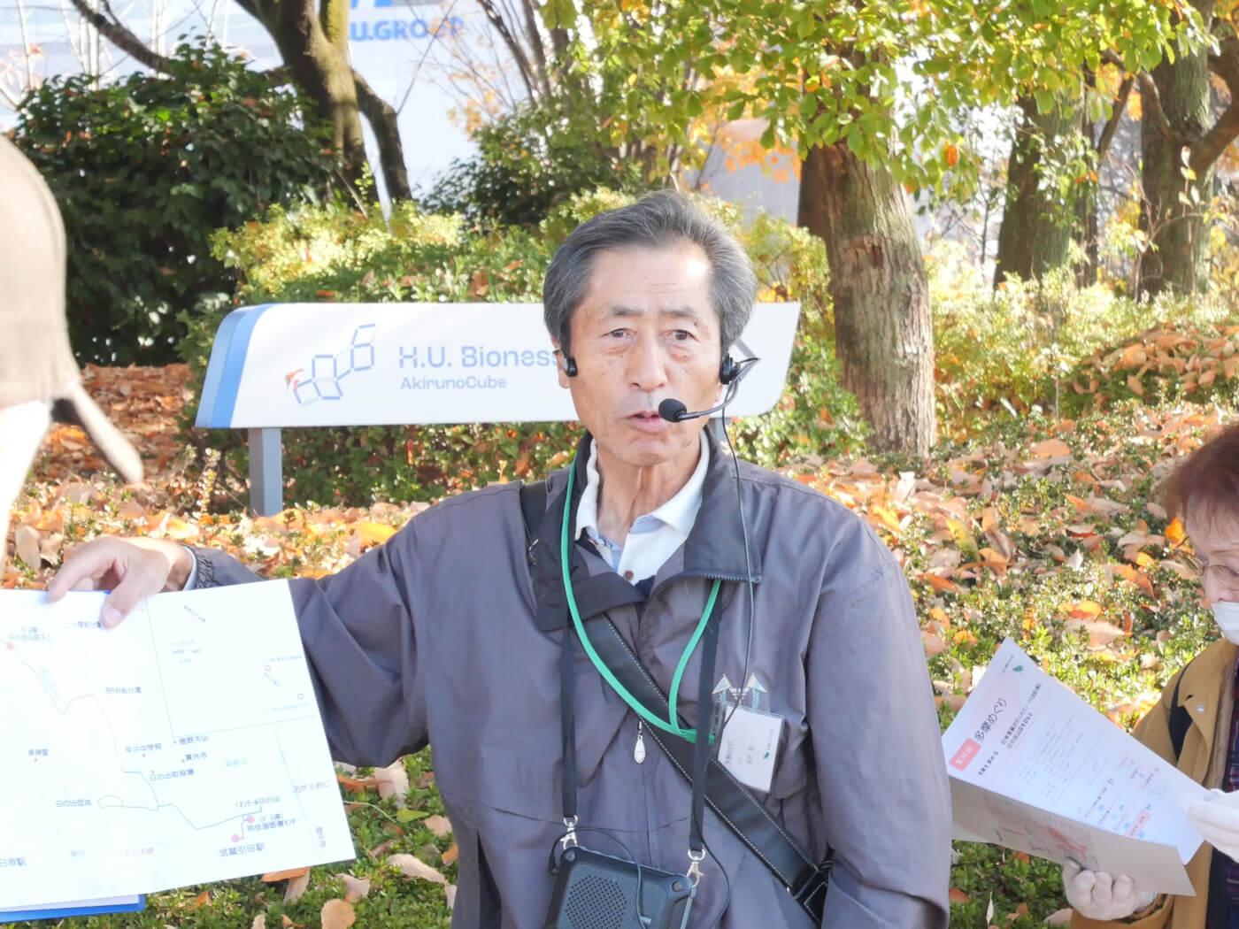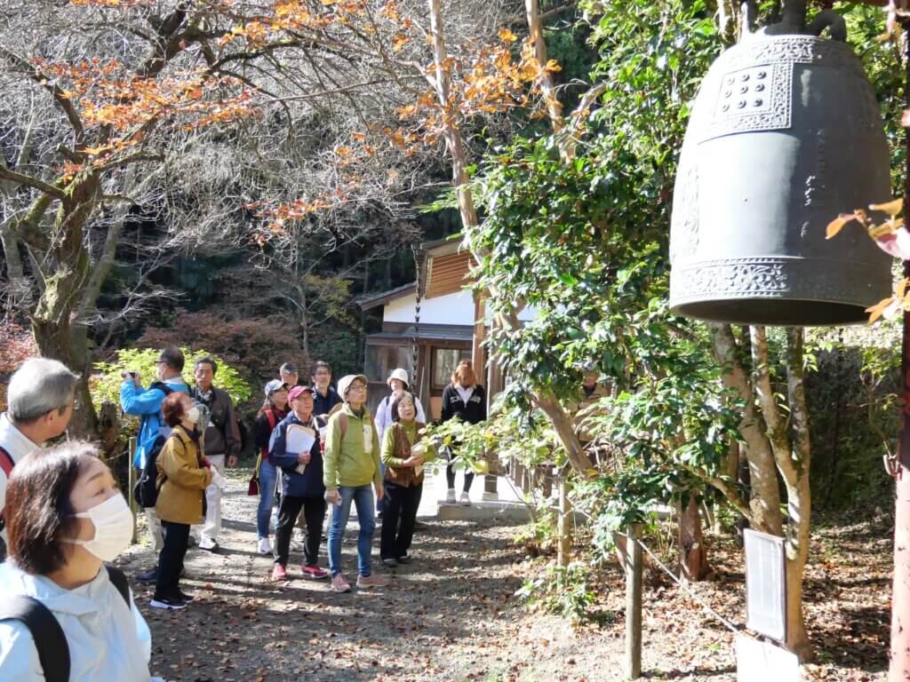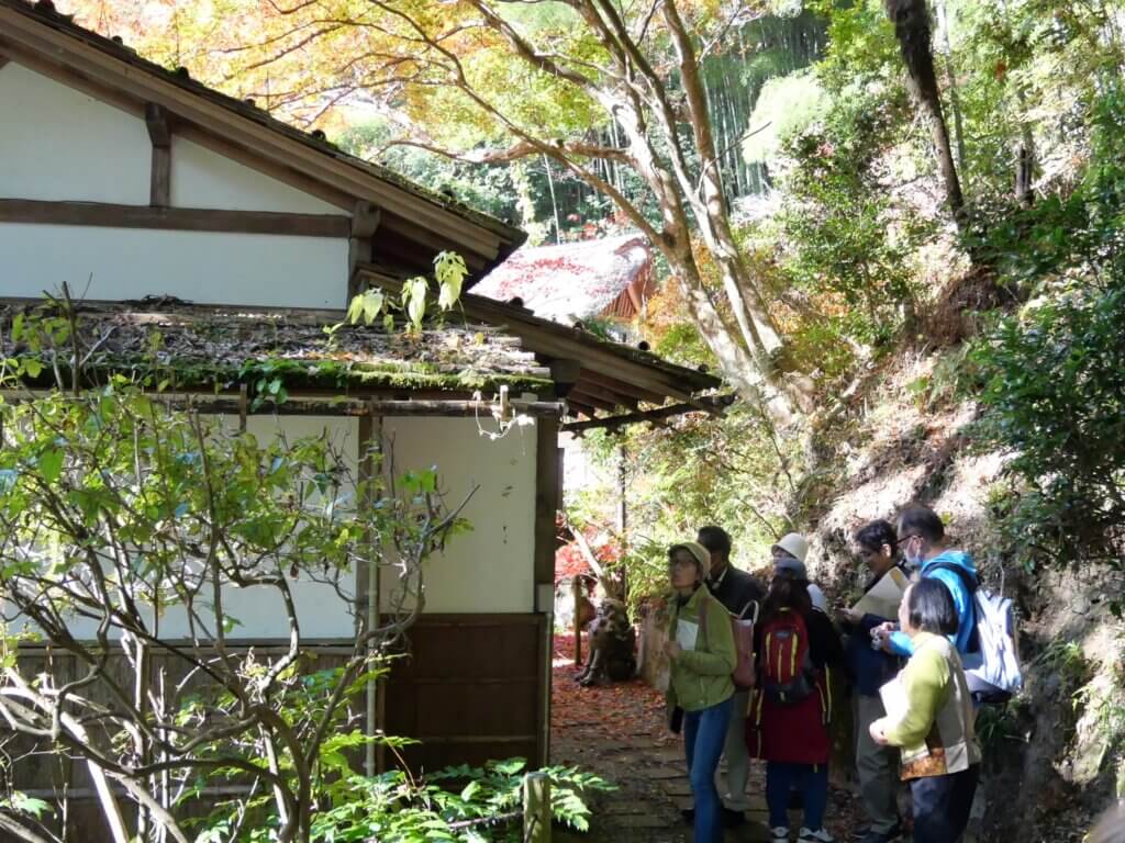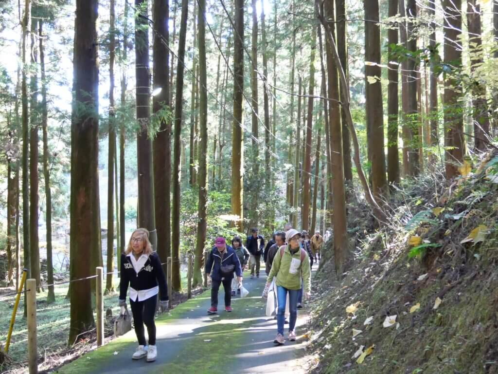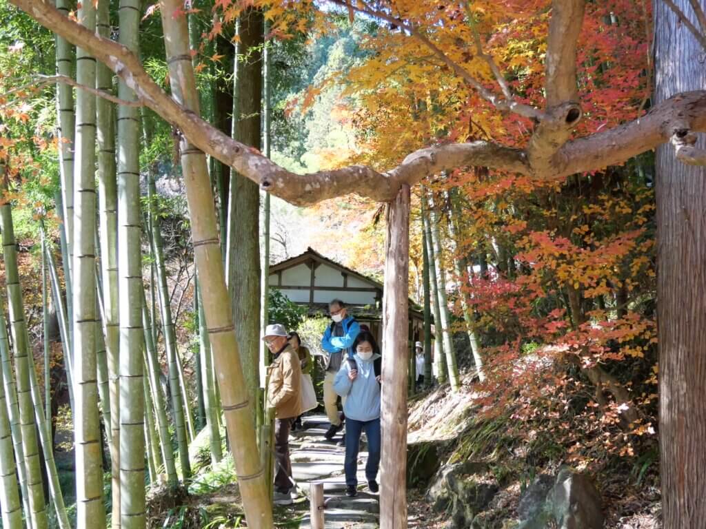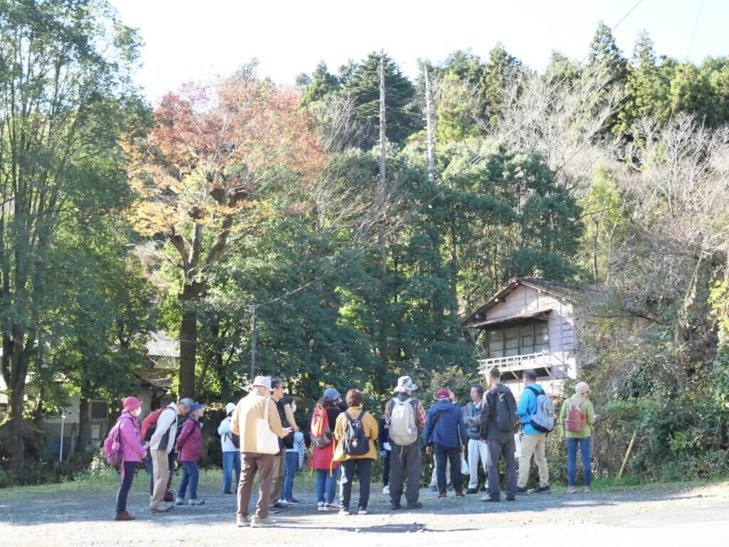 日の出山荘入口バス停に到着して、降りた広場で日の出町の概要を説明し、その中で多摩地区25市1町のごみ処分を日の出町が受け入れていることを初めて知った方が多かったようだった。説明の後、坂道を十数分歩いて日の出山荘に向かう途中の紅葉に皆さんが感動されていたこともシーズンにジャストミートした企画になった。